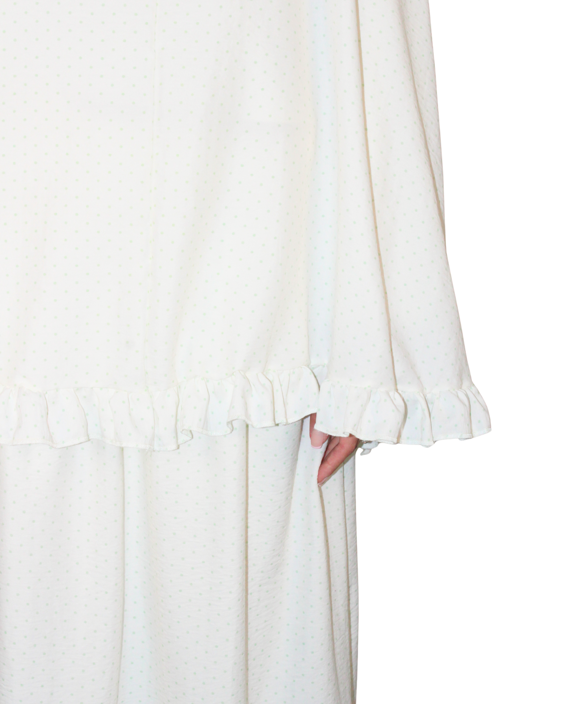 White, scattered with the faintest green polka dots that are barely there, like morning dew resting on fabric. The Dew Prayer Dress is designed for prayer without distraction. The silhouette falls freely from head to toe, offering full coverage while remaining light against the skin. The fabric moves with stillness, not stiffness, allowing you to focus entirely on the moment. Subtle detailing at the hem adds softness without overwhelming the simplicity of the piece. It feels fresh, serene, and quietly playful. It also comes with beautiful charmed pouch to carry it in.