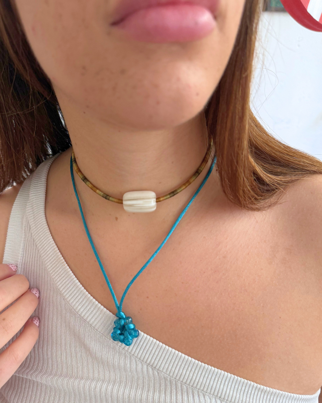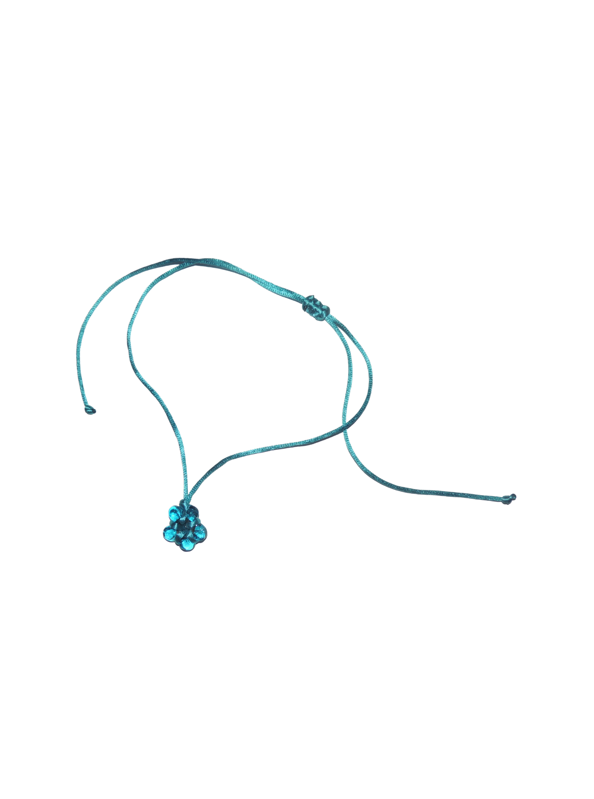 This necklace features a bright teal satin cord knotted with a clustered glass flower pendant. Its adjustable sliding design makes it easy to wear at any length. The perfect pop of colour to brighten your look, whether worn casually or to contrast a dressier fit. Each necklace comes with a handmade Kangaroo pouch, stitched and beaded for safekeeping or gifting.