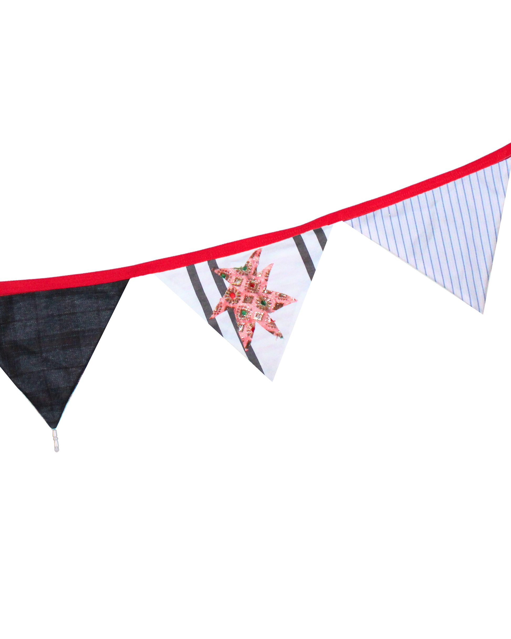 Our take on a Ramadan Zeena. nostalgic, handcrafted, and unmistakably Kangaroo. The Zeena with the Stars brings together mixed fabrics, soft textures, and bold red binding in a playful rhythm of stars. Each triangle carries its own personality, stitched together into something that feels both celebratory and intimate. Drape it across a doorway. Wrap it along a table. Let it spiral down a wall. However you style it, it brings movement, color, and a sense of handmade joy to your home.