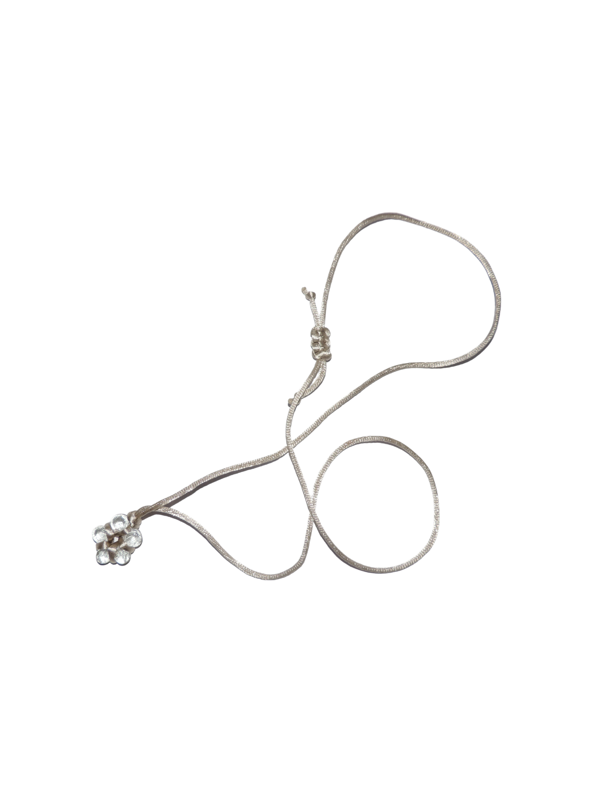 Featuring a soft metallic cord and clear clustered glass pendant, this necklace adds a light shimmer to any look. Neutral but not boring, it’s a great way to add texture without going over the top. Adjustable knot closure allows for versatility in styling. Each necklace comes with a handmade Kangaroo pouch, stitched and beaded for safekeeping or gifting.
